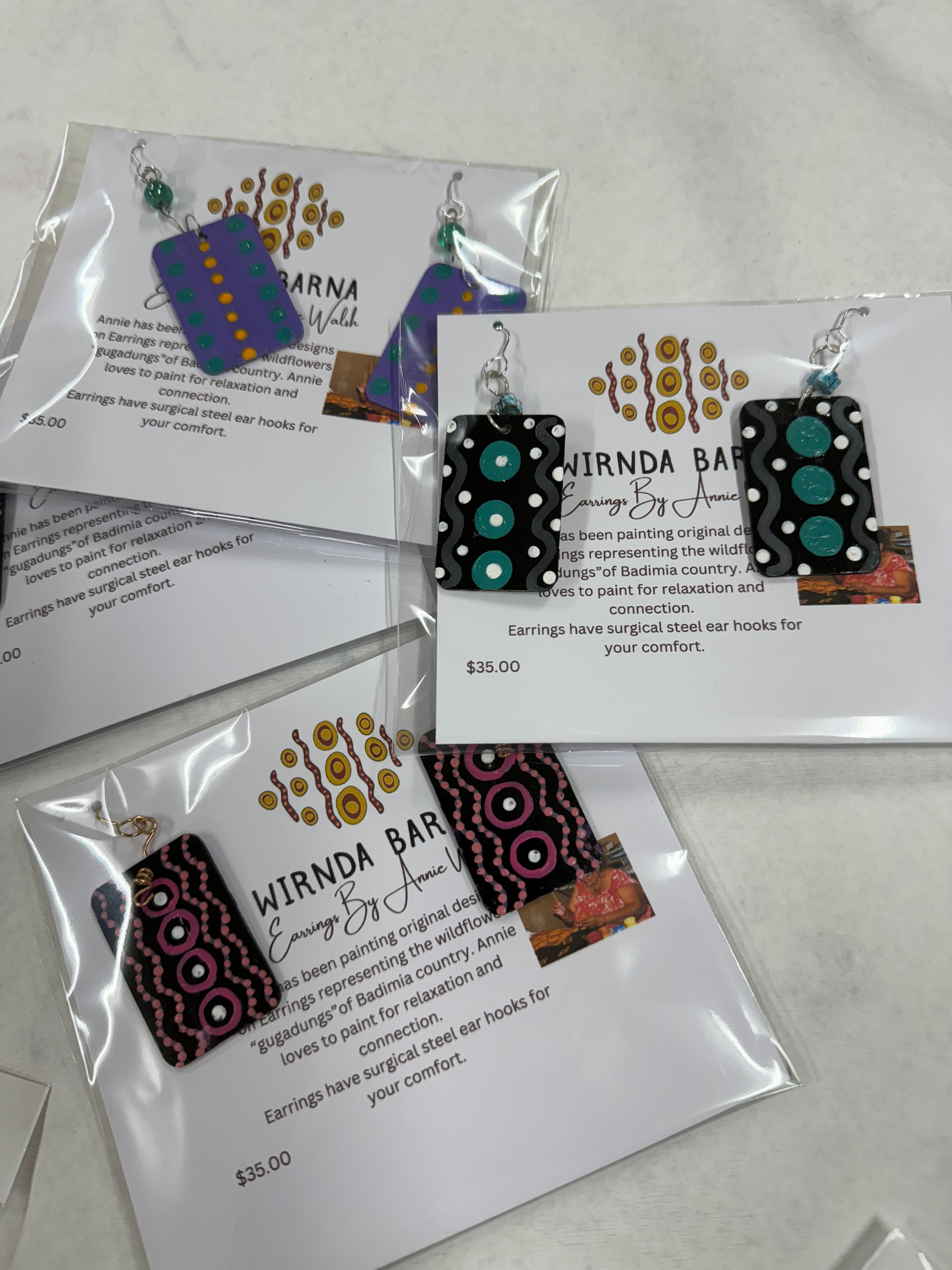 Expertly crafted by Annie Walsh, these earrings are not only unique but also high-quality. The surgical steel hooks ensure durability while the hand-painted design, sealed in resin, adds a touch of artistry. A perfect accessory for any occasion.